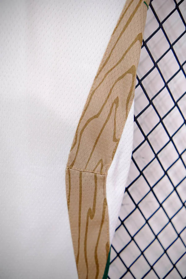 O acabamento conta com detalhes costurados e estampas premium que garantem visual fiel ao dos jogadores da NBA: